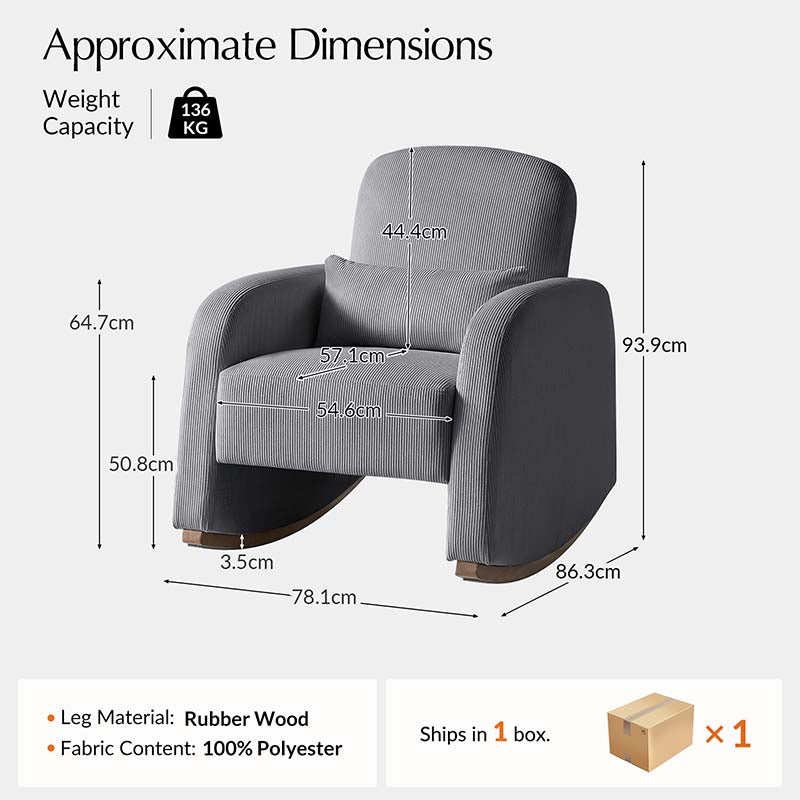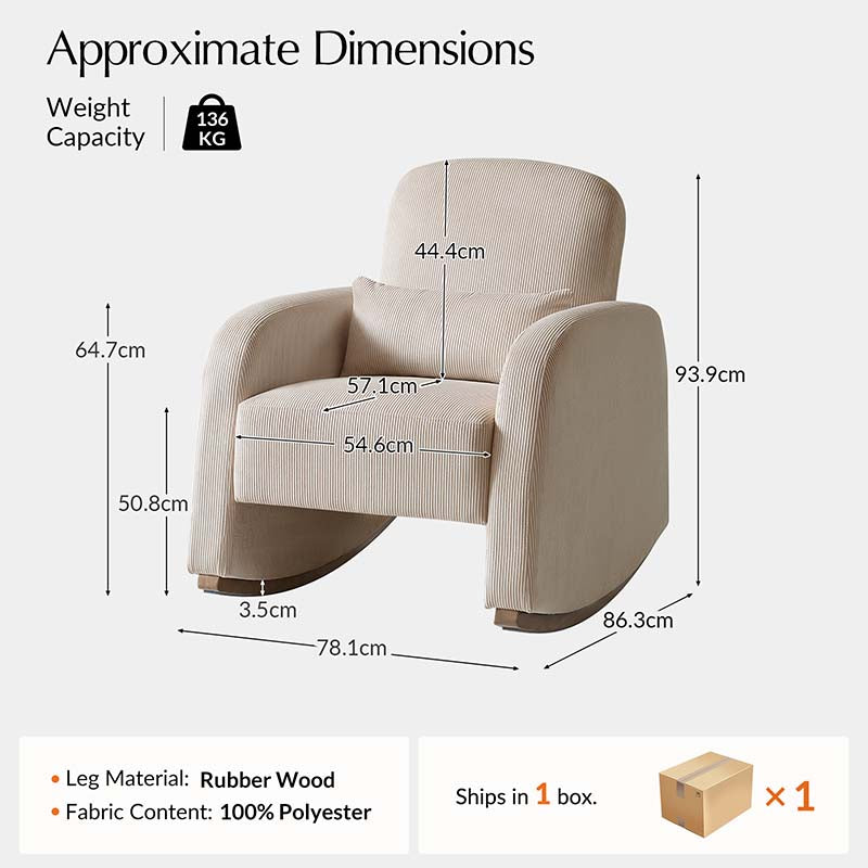 Embrace modern elegance and soothing comfort with this stylish rocking chair. Featuring a sleek modern design, it effortlessly blends into contemporary living spaces. The frame of the chair is crafted from quality solid wood, offering lasting durability and natural charm. The smooth, rounded silhouette adds a touch of softness and warmth, while the gentle rocking motion provides a relaxing experience. Designed with ergonomic support in mind, it comes with a lumbar pillow to enhance comfort and promote healthy posture. Upholstered in corduroy fabric, the surface features a subtle ribbed texture that adds depth and visual interest, while remaining gentle to the touch. Whether placed in a reading corner, nursery, or living room, this rocking chair is the suitable spot to unwind. With its minimalist aesthetic and thoughtful design, it’s more than just a seat—it’s a stylish retreat for everyday relaxation.