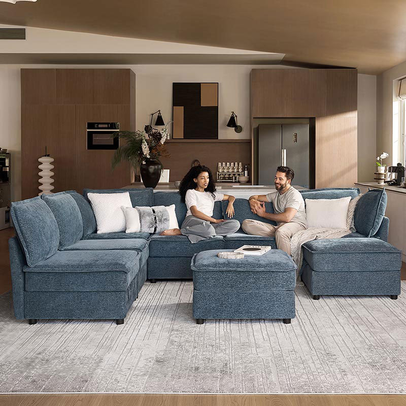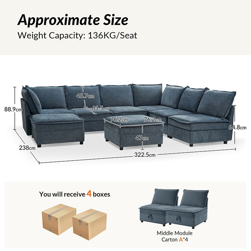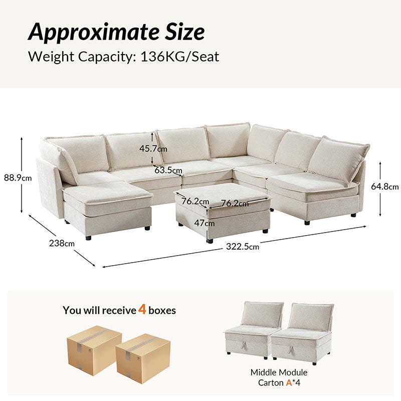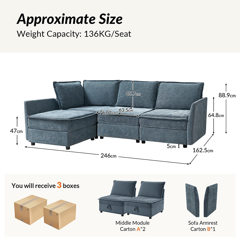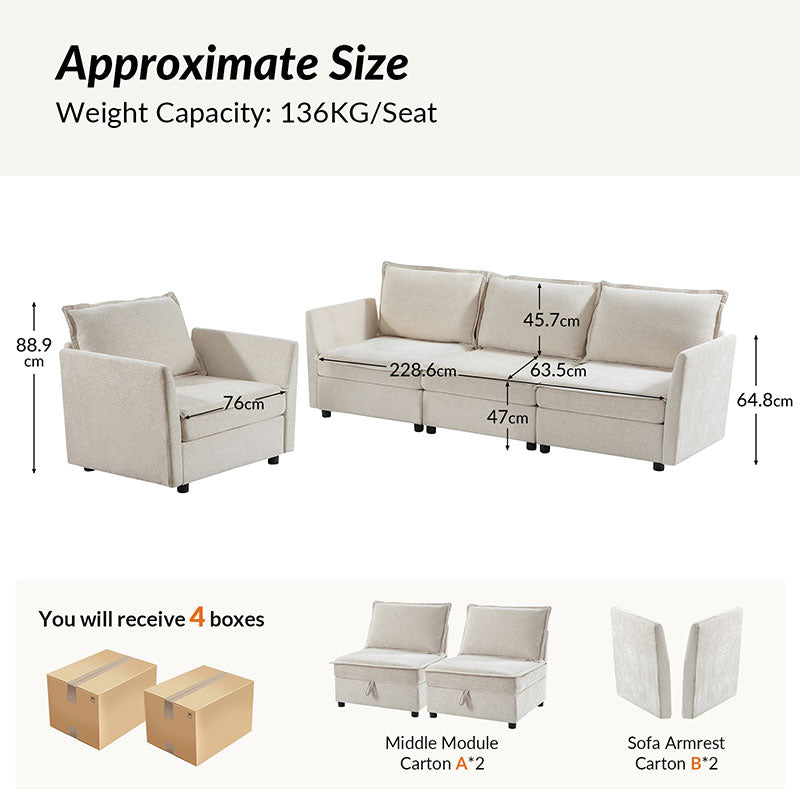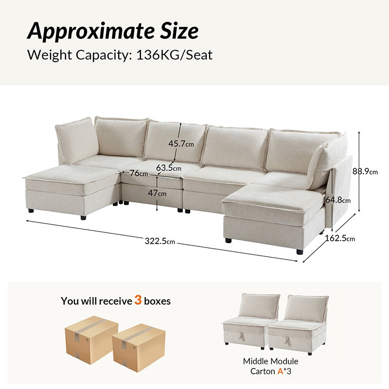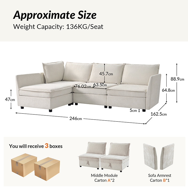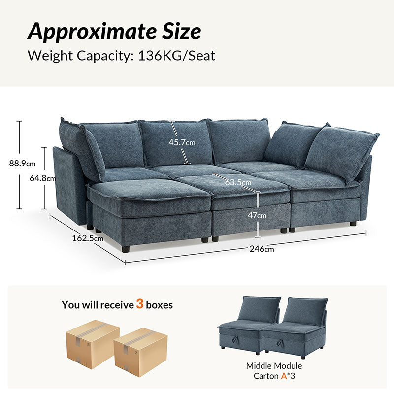 This modular sofa is designed for maximum comfort and versatility. Featuring 1.5x extra-wide seats, it caters specifically to larger individuals and expansive spaces. The soft cushions offer exceptional comfort. Hidden storage compartments under the seats help reduce clutter and provide easy access to everyday items. Its modular design allows you to rearrange the sections to create different living room layouts. Assembly is hassle-free with no tools required, and the oversized sectional sofa's segmented packaging ensures easy transportation. Additionally, the fabric covers are removable, maintaining a fresh and clean look.