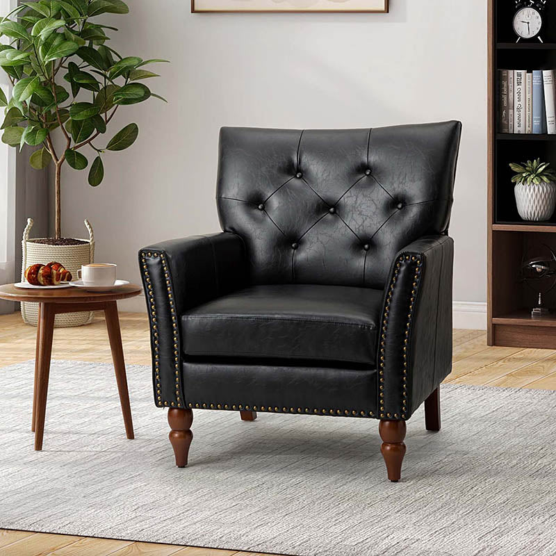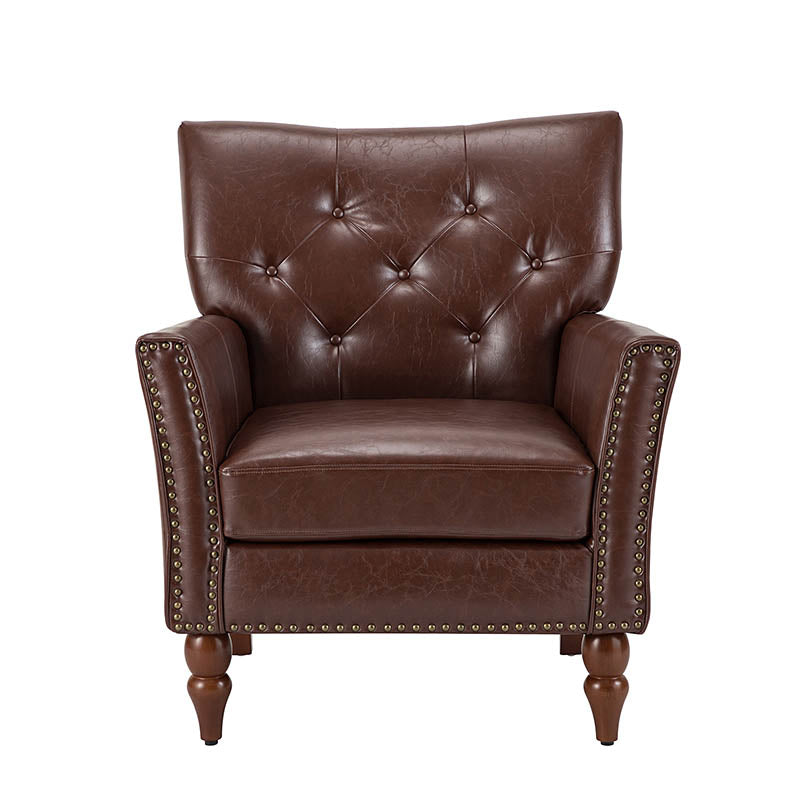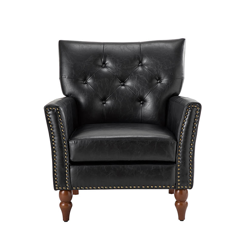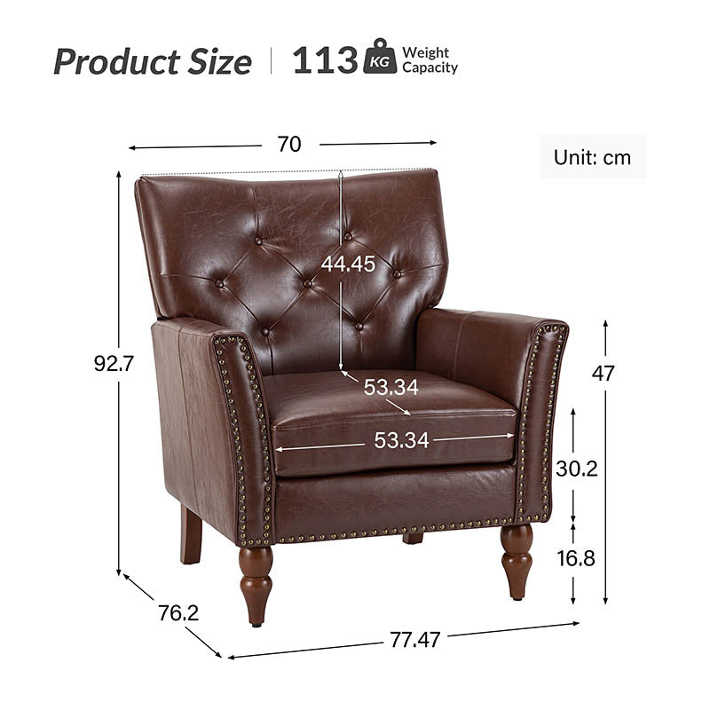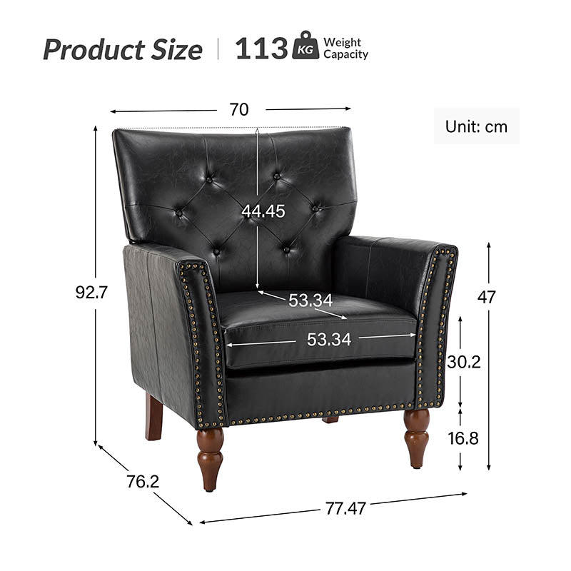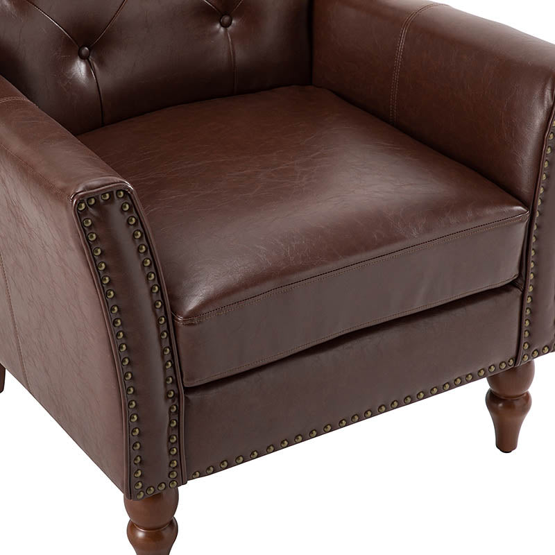 With plenty of space, this classic armchair will become your favorite lounge area. Its button-tufted back and nailhead trim design add to the sophisticated shape and it will be a great addition to your home or office space. This armchair features a solid and manufactured wood frame and four walnut solid wood legs for stability on the floor. The soft armrests support the relaxation of the arms and the whole body is stable and soft, feeling relaxed and comfortable. The cushion is filled with thick foam and sinuous S spring, so you won't feel stiff even after sitting for a long time, greatly easing the fatigue of the day. When you have guests, be sure to make it your armchair as they flock to its inviting embrace. Come and buy it now!