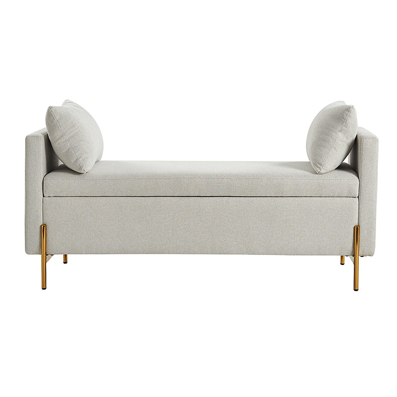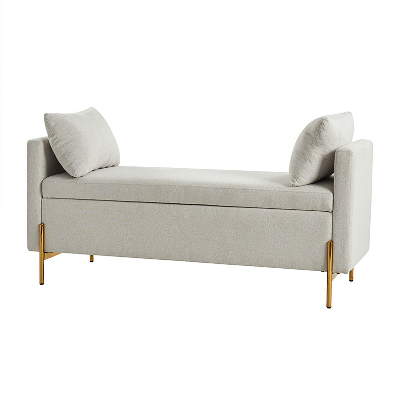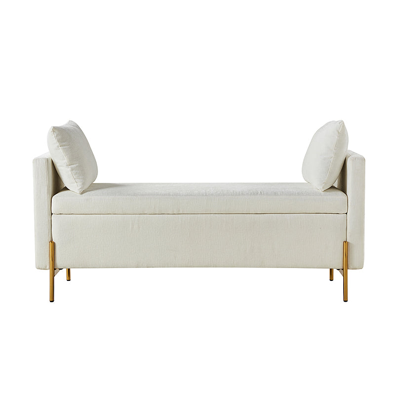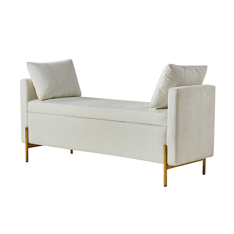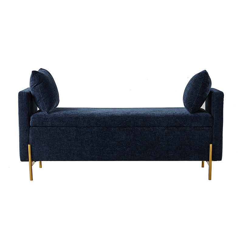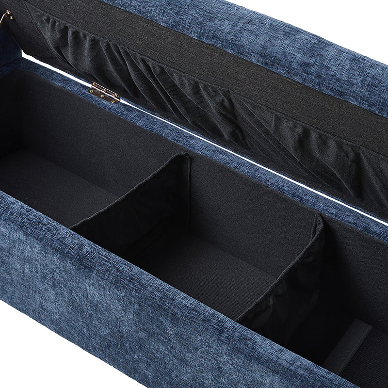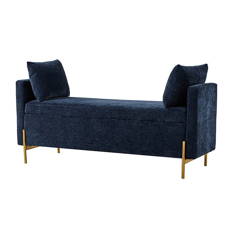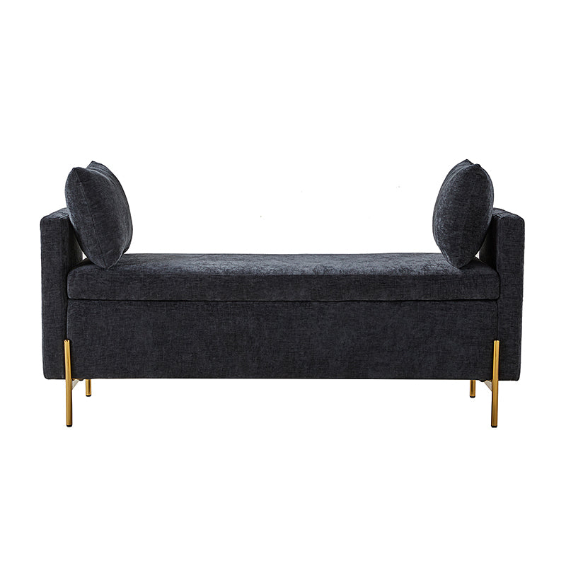 This storage bench seamlessly blends modern style and practicality, making it a versatile addition to your bedroom or entryway. Its sleek, clean-lined design is enveloped in luxurious chenille fabric and cushioned with soft foam, ensuring comfort as you sit. Its unique feature includes ample subdivided storage compartments with velcro closures, allowing you to organize your belongings with ease like pillows, blankets, or even shoes. Supported by four slim gold-finished metal legs, this bench exudes elegance and stability, making it an ideal choice for placing at the foot of your bed or in your foyer. Enjoy the convenience of adjustable storage space and the beauty of modern design with this chic and functional bedroom or entryway bench.