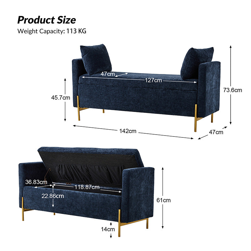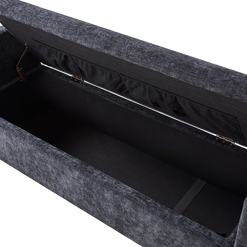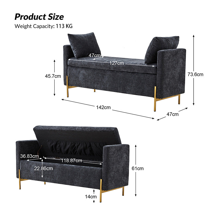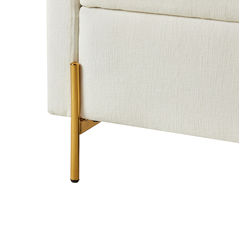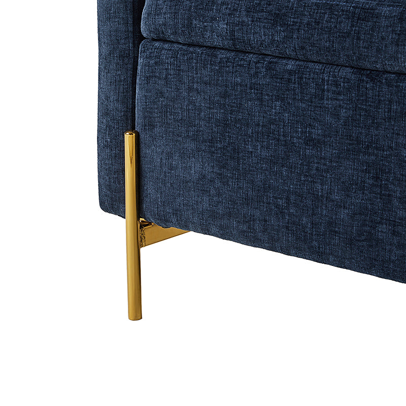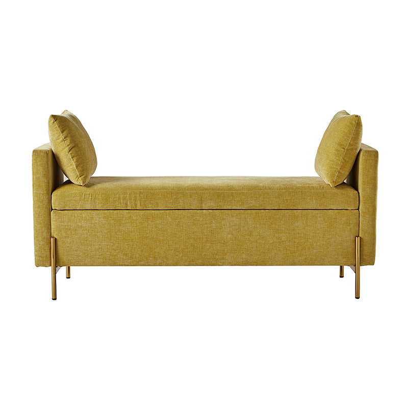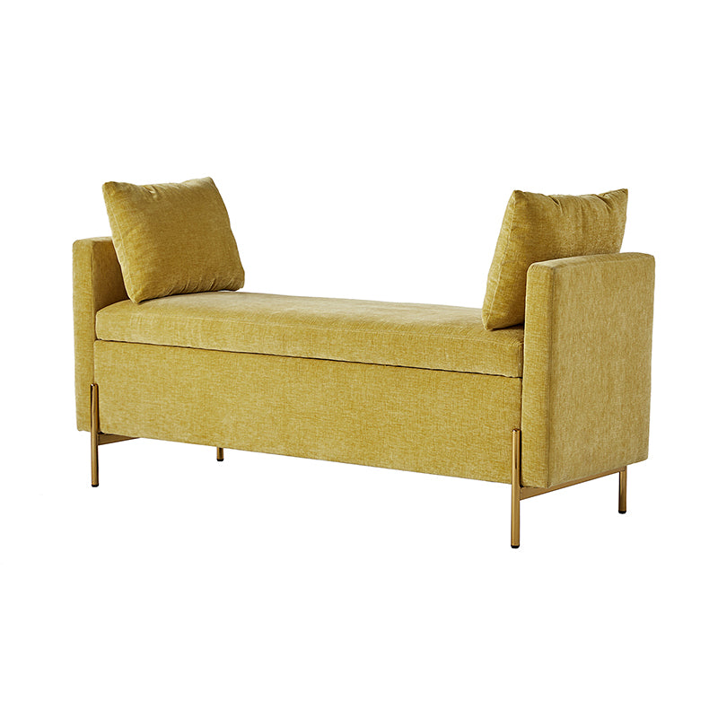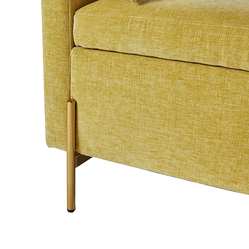 This storage bench seamlessly blends modern style and practicality, making it a versatile addition to your bedroom or entryway. Its sleek, clean-lined design is enveloped in luxurious chenille fabric and cushioned with soft foam, ensuring comfort as you sit. Its unique feature includes ample subdivided storage compartments with velcro closures, allowing you to organize your belongings with ease like pillows, blankets, or even shoes. Supported by four slim gold-finished metal legs, this bench exudes elegance and stability, making it an ideal choice for placing at the foot of your bed or in your foyer. Enjoy the convenience of adjustable storage space and the beauty of modern design with this chic and functional bedroom or entryway bench.