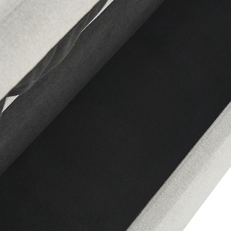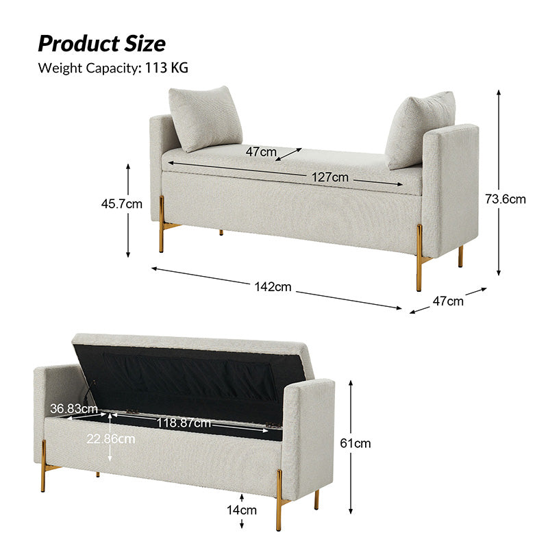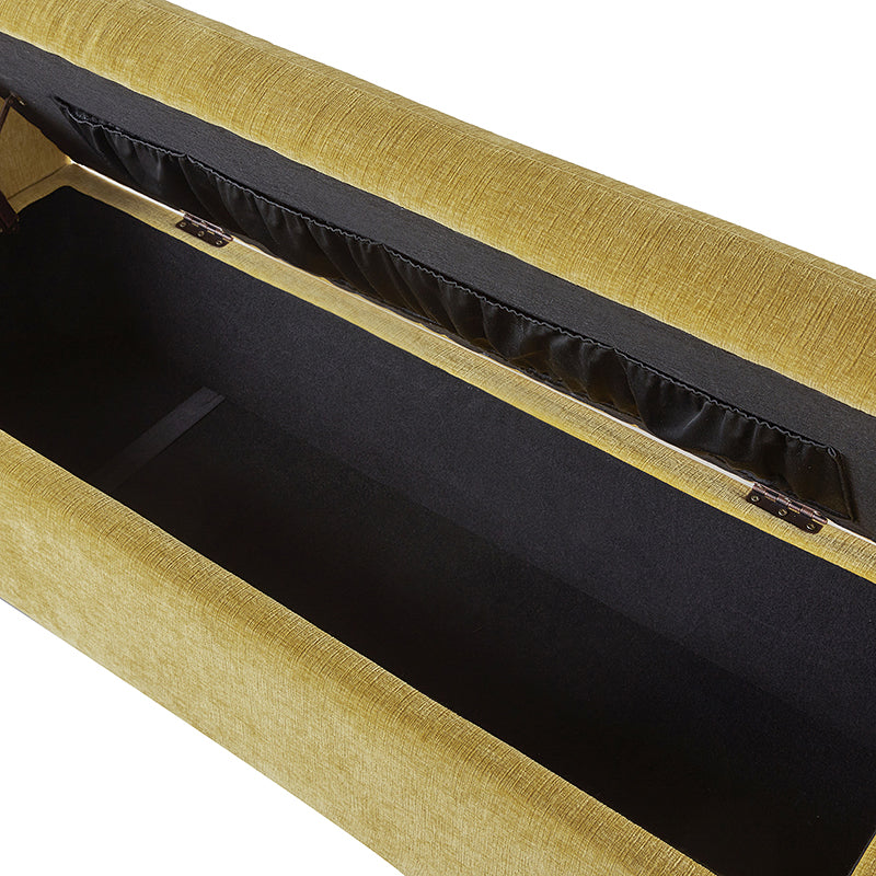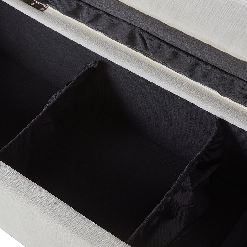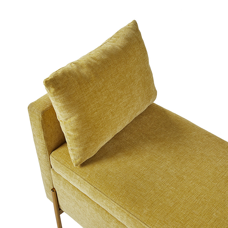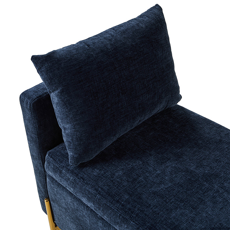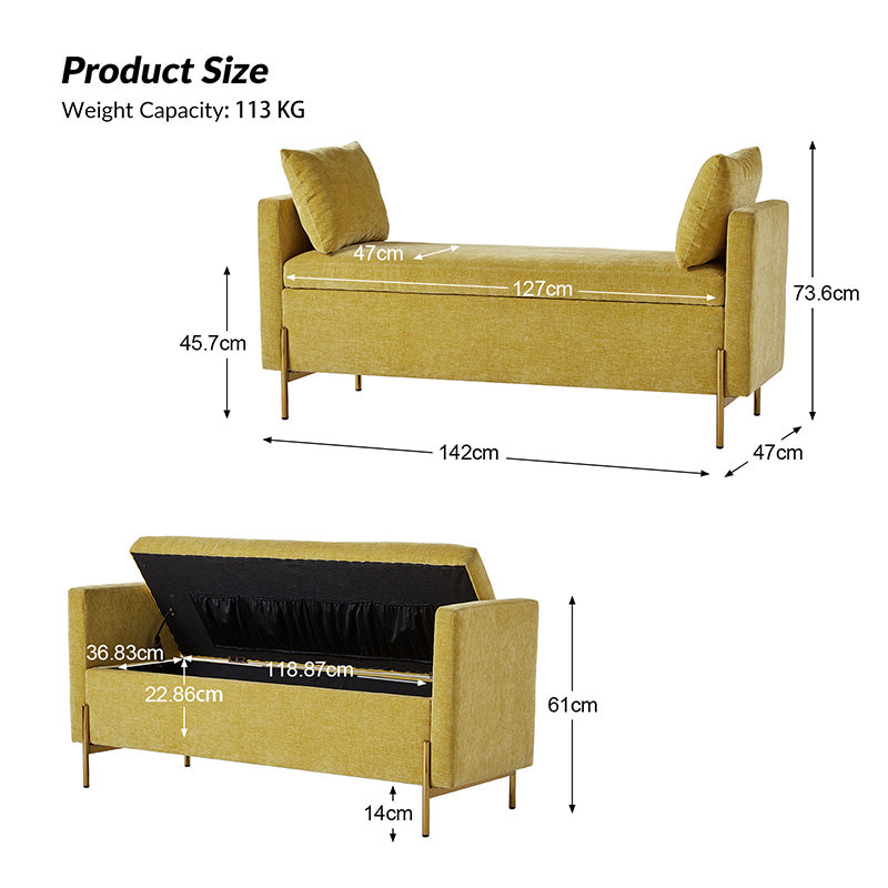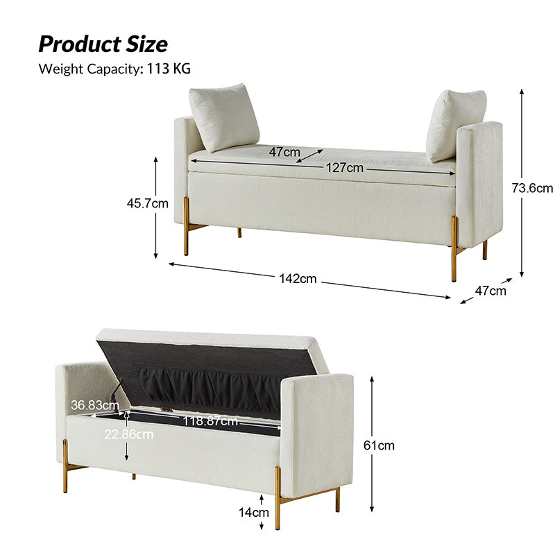 This storage bench seamlessly blends modern style and practicality, making it a versatile addition to your bedroom or entryway. Its sleek, clean-lined design is enveloped in luxurious chenille fabric and cushioned with soft foam, ensuring comfort as you sit. Its unique feature includes ample subdivided storage compartments with velcro closures, allowing you to organize your belongings with ease like pillows, blankets, or even shoes. Supported by four slim gold-finished metal legs, this bench exudes elegance and stability, making it an ideal choice for placing at the foot of your bed or in your foyer. Enjoy the convenience of adjustable storage space and the beauty of modern design with this chic and functional bedroom or entryway bench.