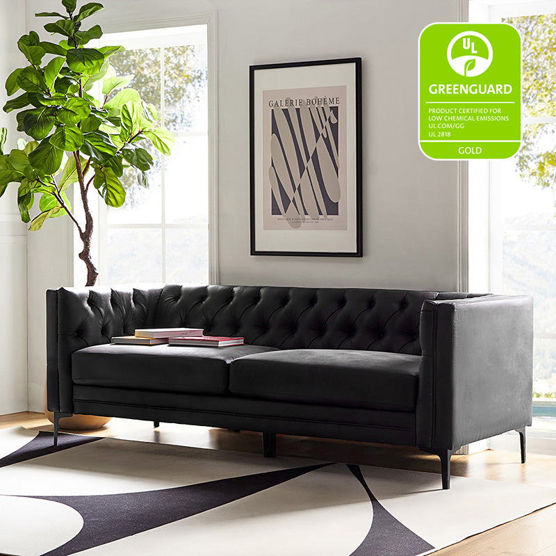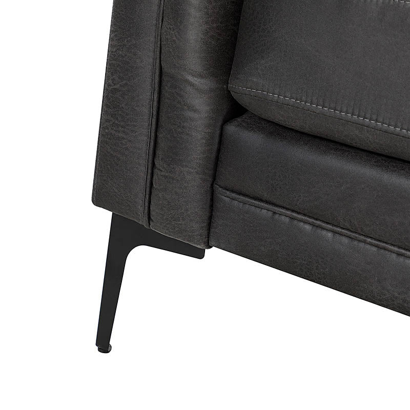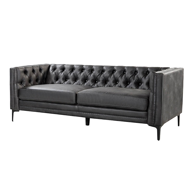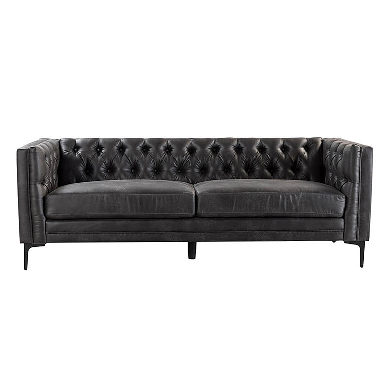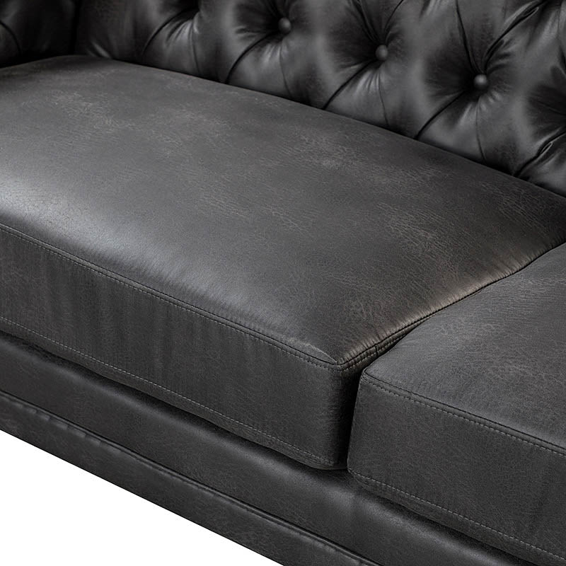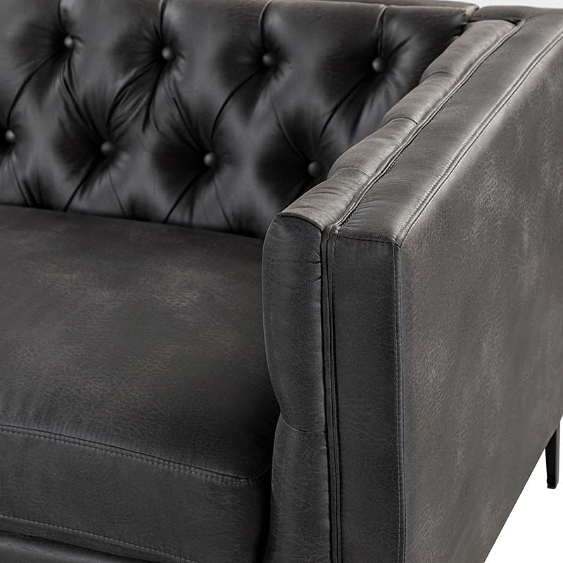 Looking to add a leather tufted sofa to your home? This one is in keeping with your glam sensibilities, adding an eye-catching touch to your space. Set the focal point for your mid-century modern living space when you add this tufted leather love seat. This versatile mid-century tufted sofa is breathable, soft, and durable. Streamlined and casual, this leather sofa looks good in any interior design. The metal legs for a look that is emblematic of the modern style, while button-tufted details on the seat back add a hint of textural appeal. Crafted with solid and manufactured wood. This comfortable modern tufted sofa with soft armrests stands out in the living room, study, entertainment area, family, or small apartment. Two Toss pillows add an extra dash of distinction to this eye-catching design.