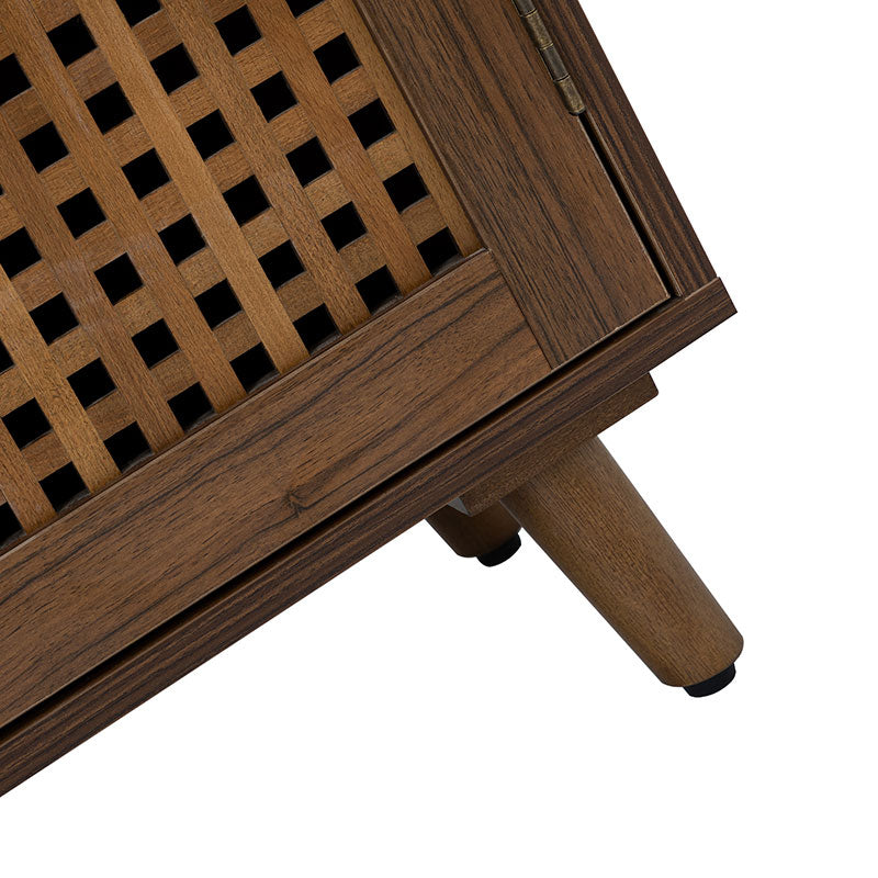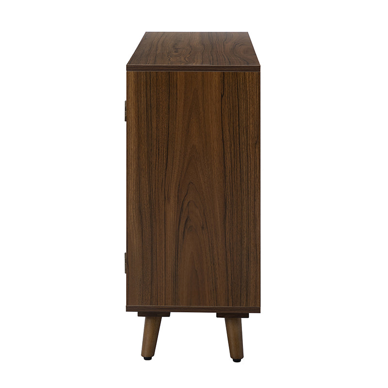 Behind the solid wood cabinet doors lies a spacious storage area with multiple shelves, ideal for organising everything from tableware and books to everyday essentials. The splayed wooden legs lend a subtle mid-century feel, while the natural finish makes it easy to pair with a range of interior styles.