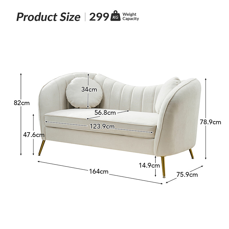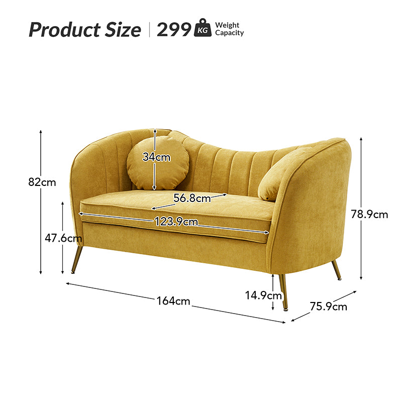 This contemporary loveseat features premium polyester upholstery that is both classy and sumptuous against your skin. A single seat cushion and round arms curve into a low, special back, creating a perfect, modern piece for your home. Gold metal legs support this loveseat and provide a stunning contrast to the soft fabric. The cushion is filled with high-density foam, which will not easily get deformed, giving you an enjoyable rest experience, like falling into the cotton or lying in the clouds. Two soft pillows add more comfort to it. You will love this loveseat, whether you're stretching out after a long day at work, enjoying a movie night, or engaging in a discussion with your friend, this loveseat supports the sweet time of being at home with the one you love.