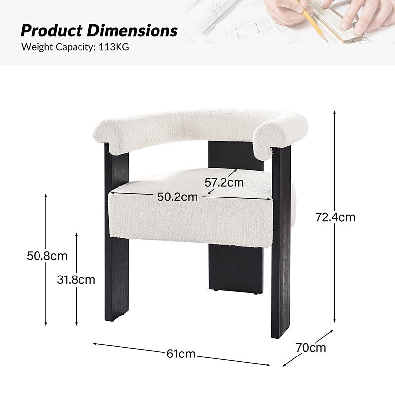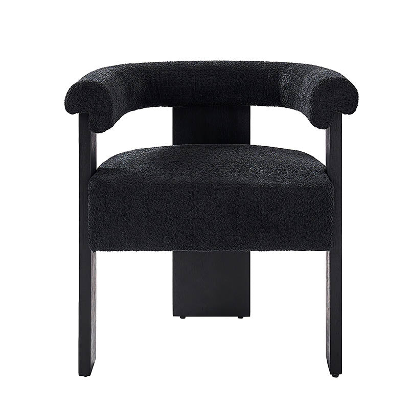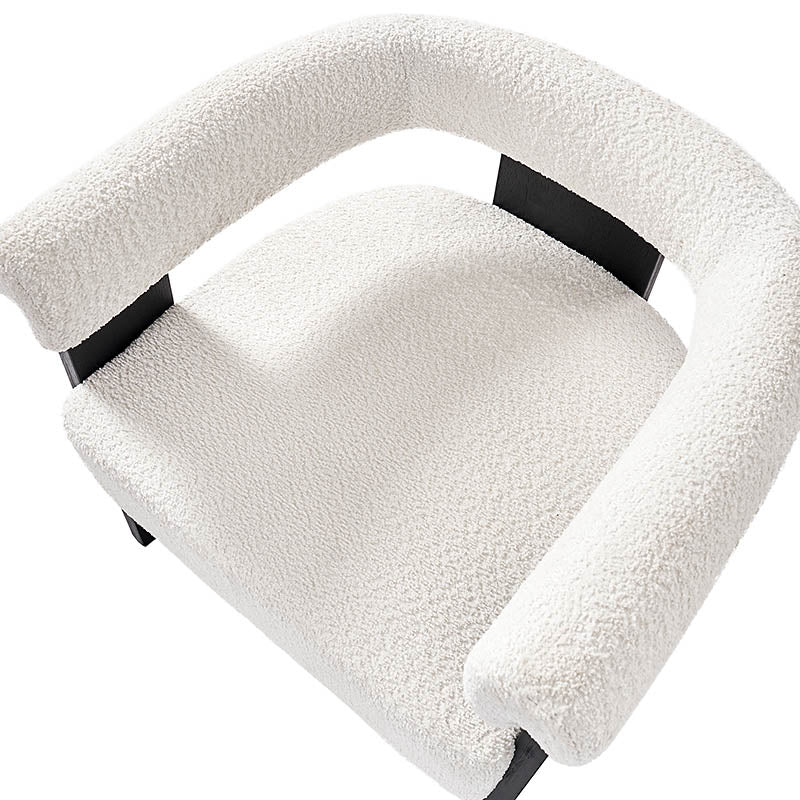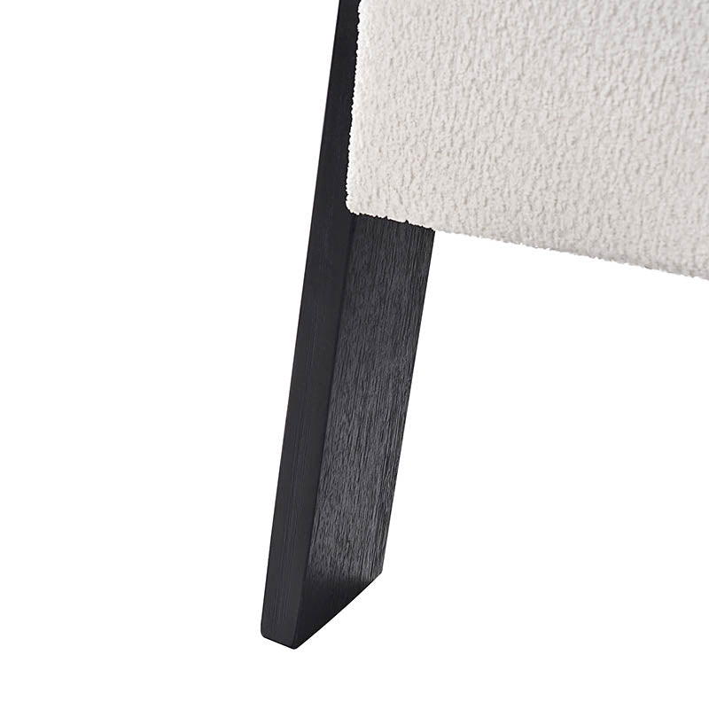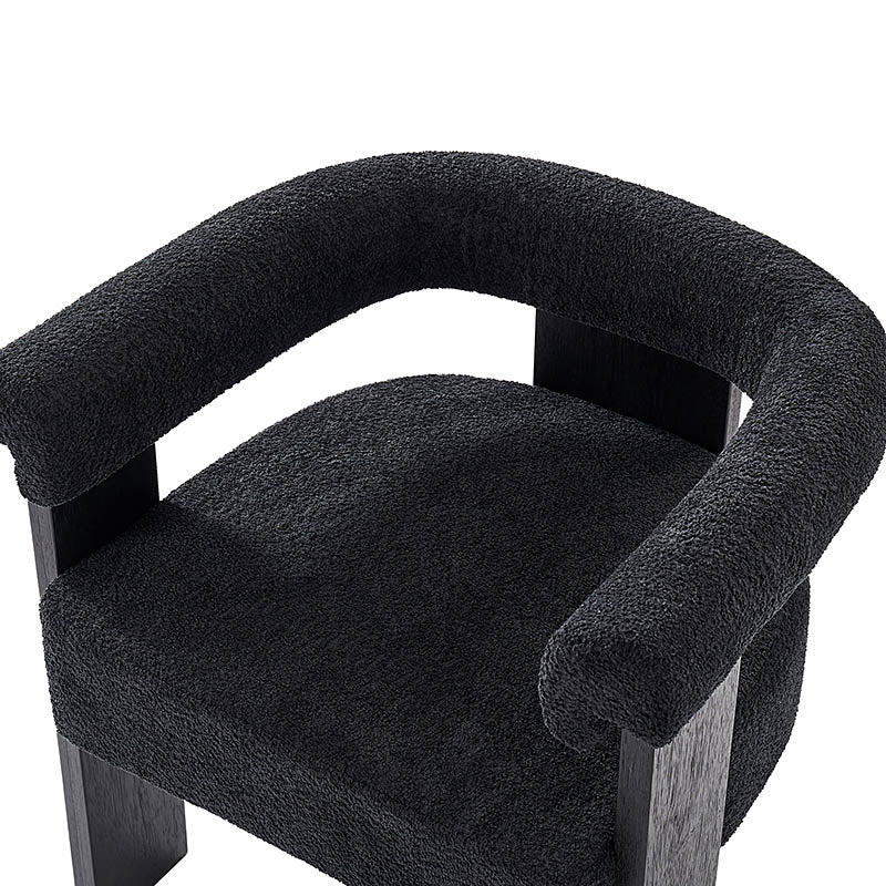The dining chair epitomizes modern elegance with its sleek design. Upholstered in quality boucle fabric, the dining chair offers a tactile and inviting seating experience. Its lamellar foot ensures stability and durability, while the rubber wood solid wood legs provide a natural and sophisticated touch. The chair's solid back offers support, promoting comfort during meals or gatherings. The round backrest adds a contemporary flair, creating a visually appealing silhouette that complements various dining spaces. With a harmonious blend of comfort, style, and quality craftsmanship, the dining chair is not just a piece of furniture but a statement of refined taste and contemporary living.