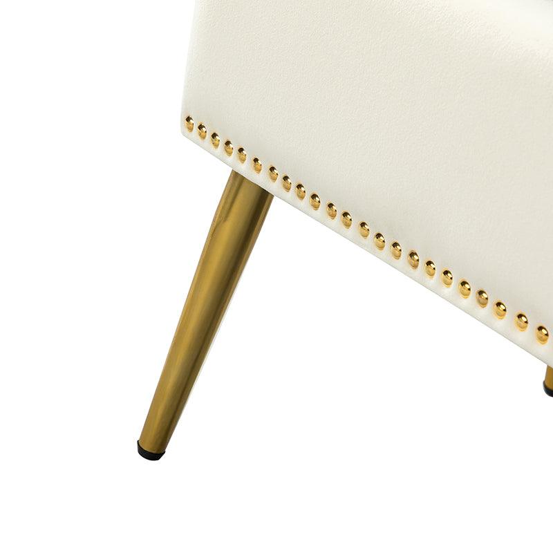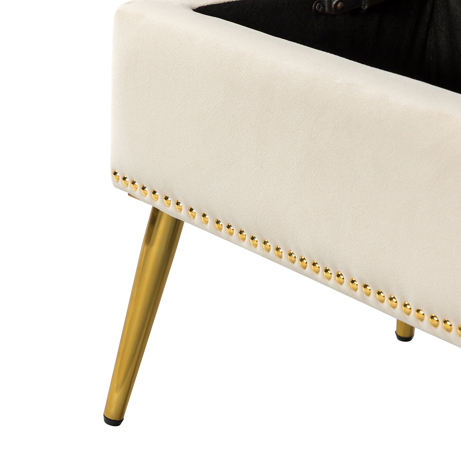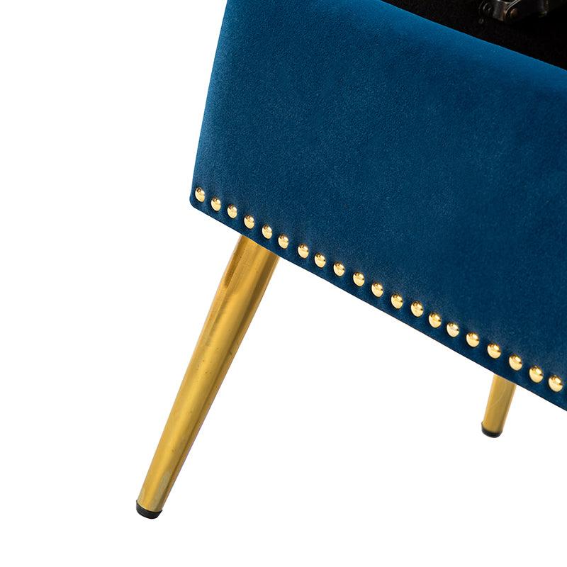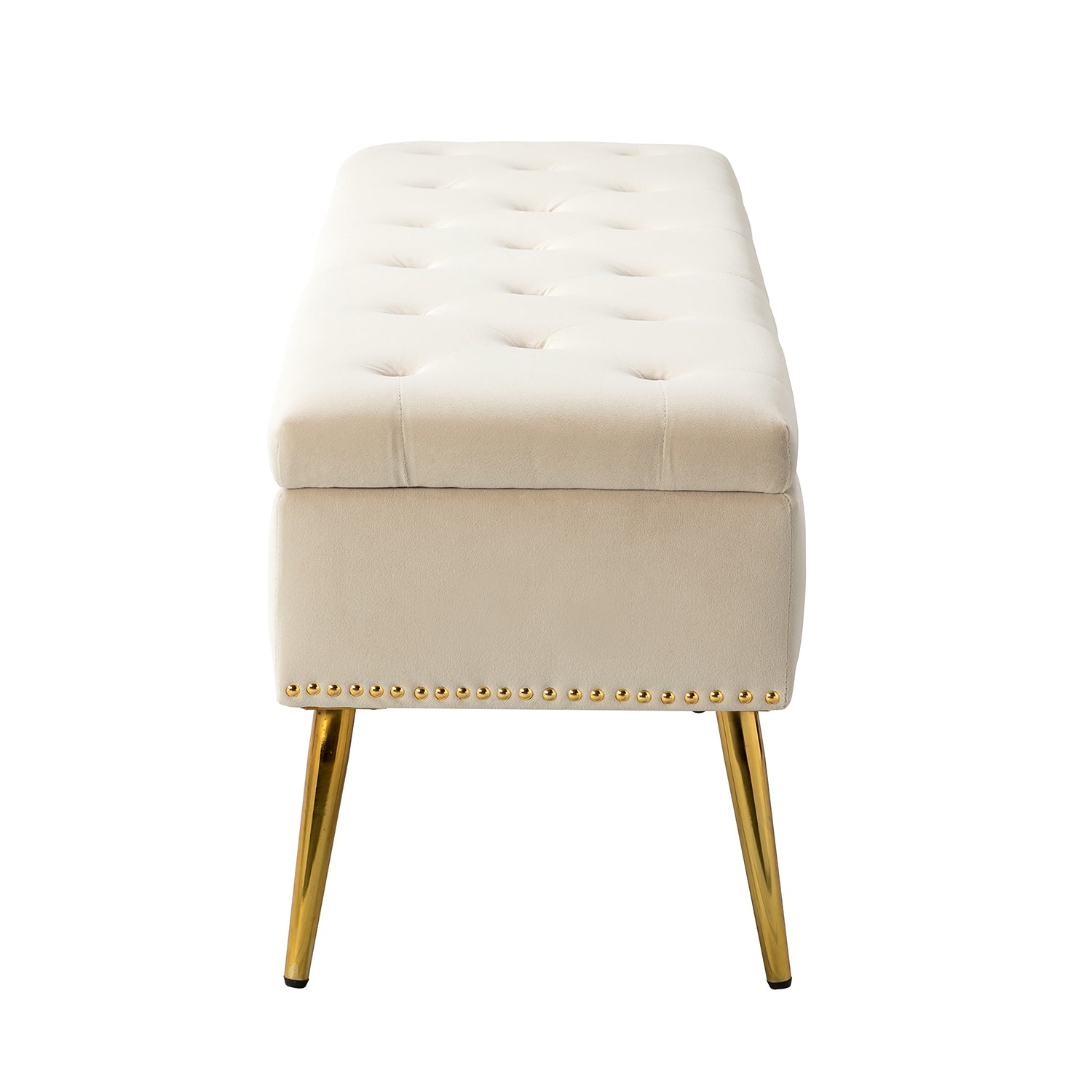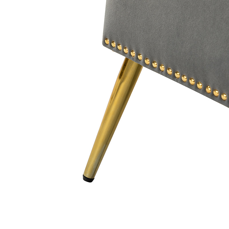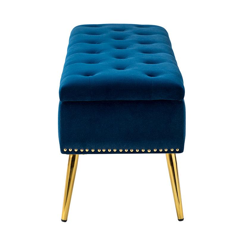 Easy to put together just screw on legs. Plenty of storage tufted and sturdy and the perfect color. Has gold nail head and fold legs.