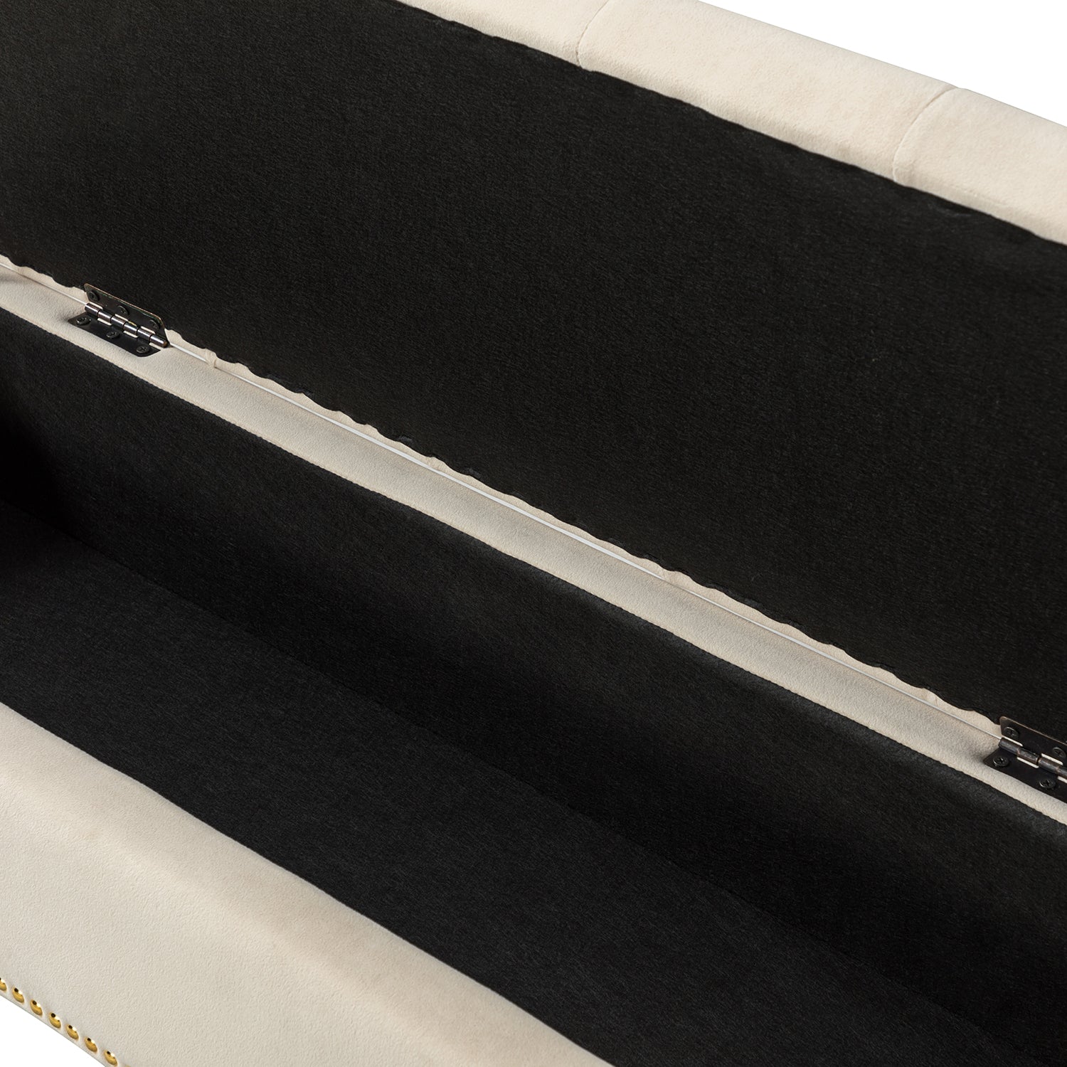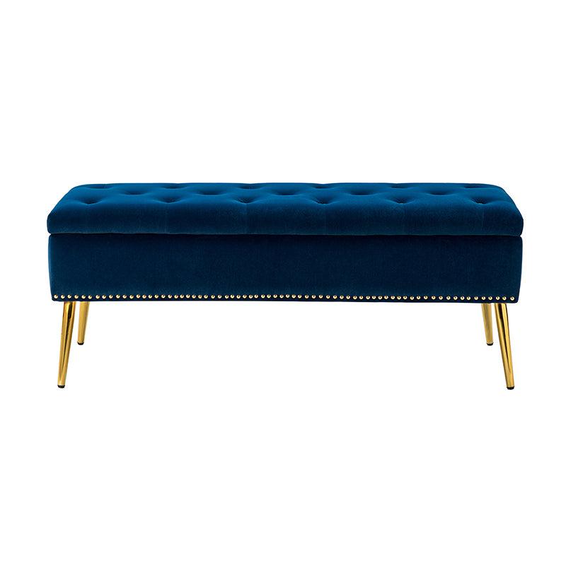 Such a lovely quality end of bed storage bench. Easy to put together, sturdy, gorgeous color & velveteen fabric. Lid stays open! We love it!