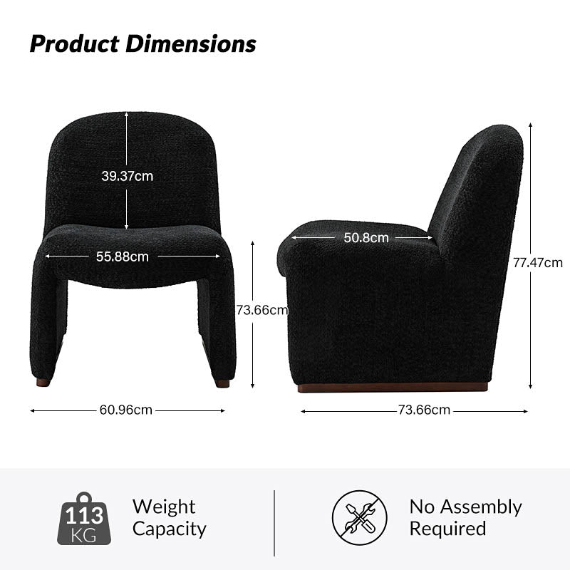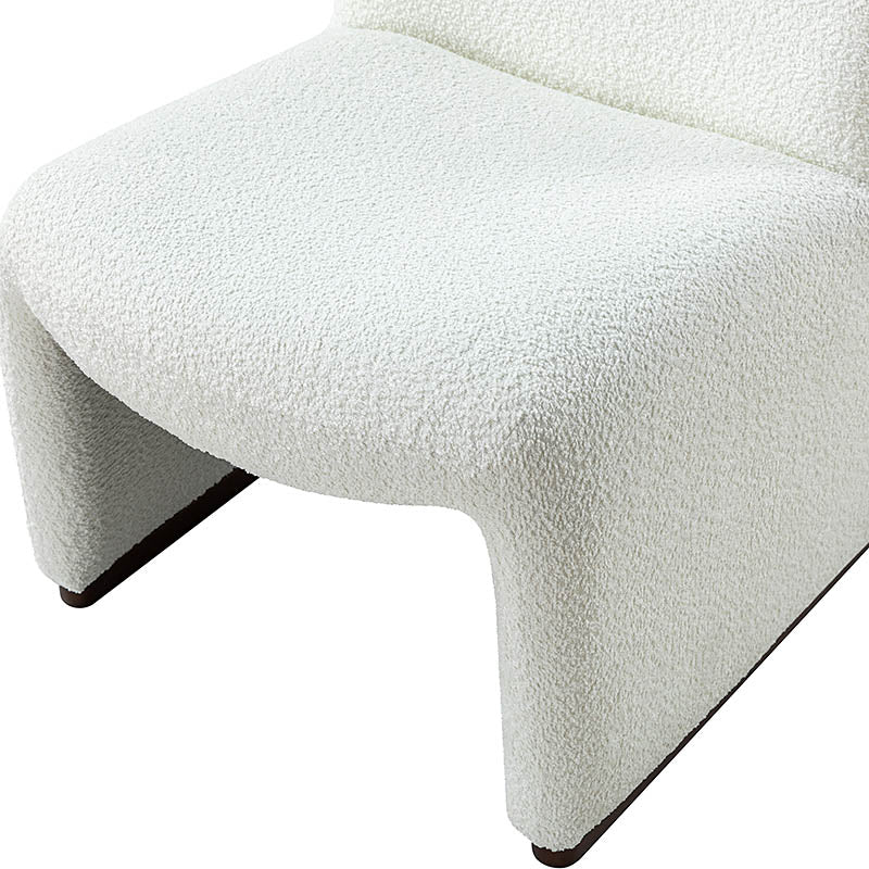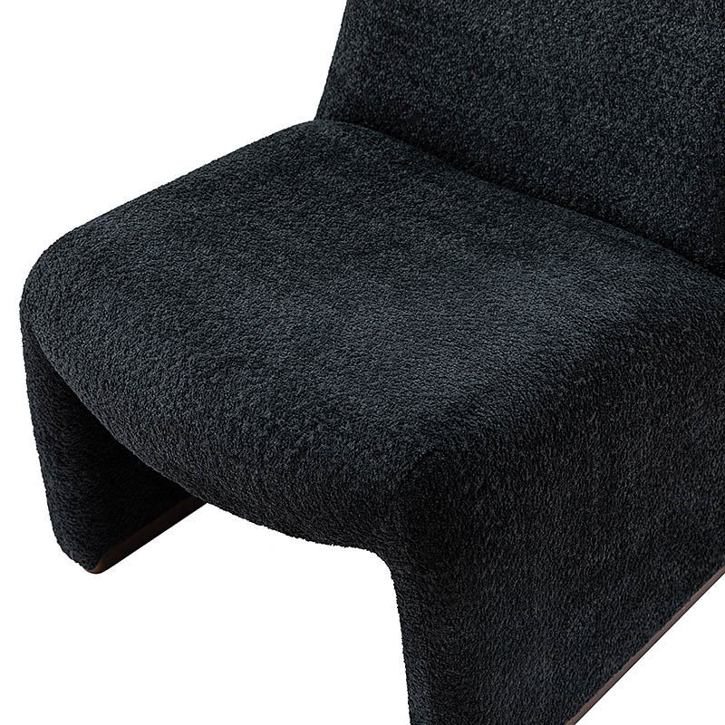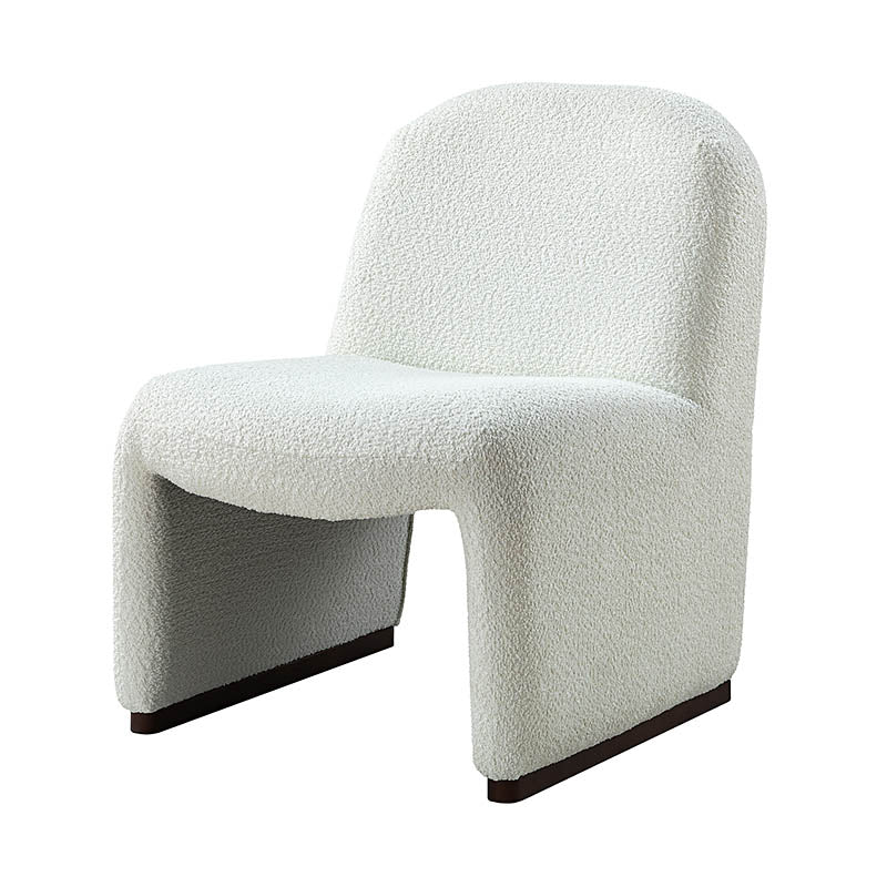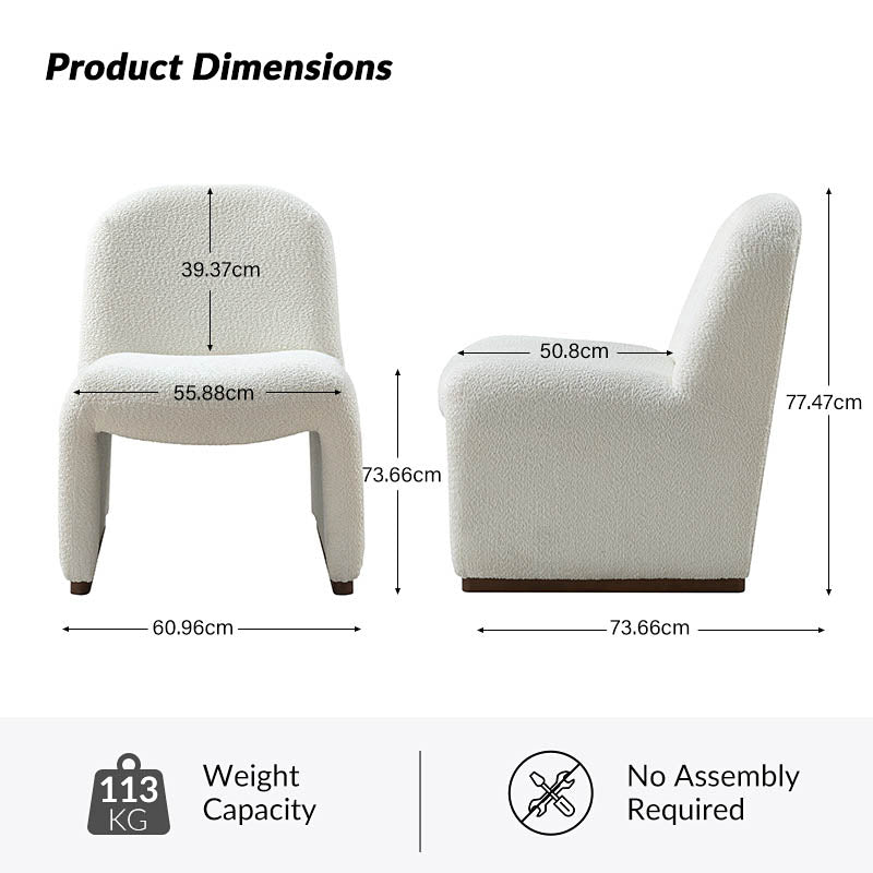 Striking an elegant silhouette with an arcuate seat, simplified profile, and soft curves, this streamlined side chair is the best statement of the modern update. Upholstered from the feet to the back of the mid-century accent chair in a beautiful Boucle, it's a perfect pick to sink in. Founded atop hardwood legs that feature an alluring walnut hand-crafted finish, the arcuate seat gradually releases the hip pressure from the middle to the sides. Exuding effortless appearance and function, the unique side chair seamlessly blends the comfort of Boucle with an ergonomic design. this side chair offers maximum seating in minimum space, making it a versatile addition to various areas such as your living room, bedroom, office, or study. Whether you place it next to a sofa or pair it with an ottoman, it effortlessly adds glamour and a touch of bohemian flair to your interior decor. Plus, you can enjoy the convenience of not having to worry about assembly, as this chair comes ready to enhance your space with its boho aesthetic and functional design.