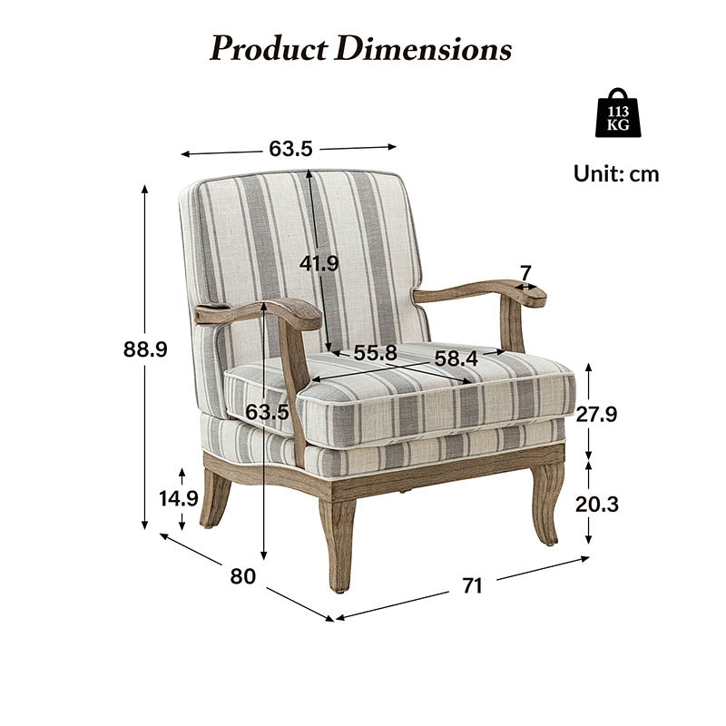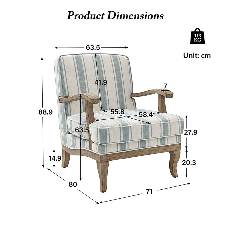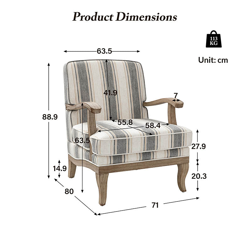 Providing a cozy spot for your moments of relaxation and rounding out your style inadvertently, this farmhouse style armchair coming as the one is effortless to incorporate into any corner. Handcrafted with attention to detail, every curve and detail is carefully crafted to ensure high-quality craftsmanship and a refined appearance. Equipped with the romantic striped armchair to refresh your eyes, this comfy armchair has high-strength spring support ensuring that the seat will not collapse after frequent use. Solid wood armrests will enhance the overall firmness while 4-foot pats are apt to protect your floor. Featuring gracefully curved feet, a comfortable backrest, and a cushion can easily eliminate your fatigue after a long day's work. With its blend of traditional charm and modern sensibility, this armchair is the perfect addition to any home decor.