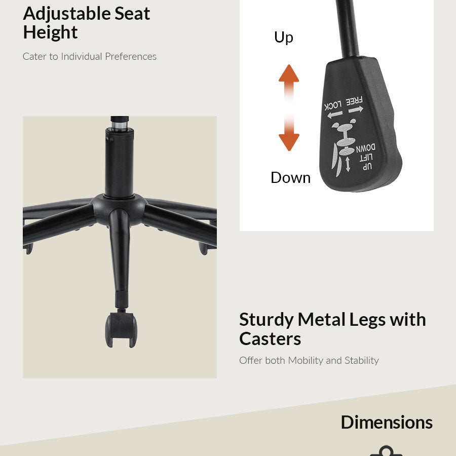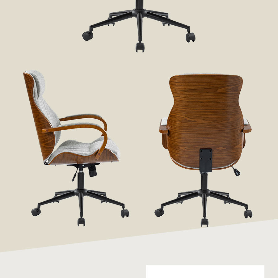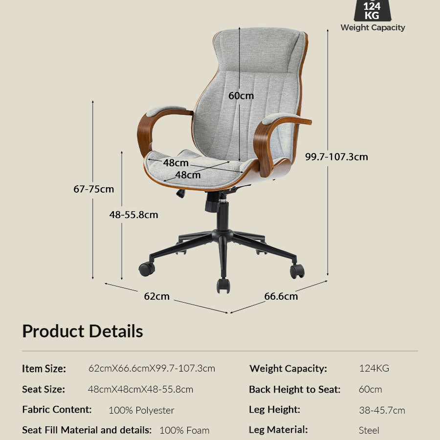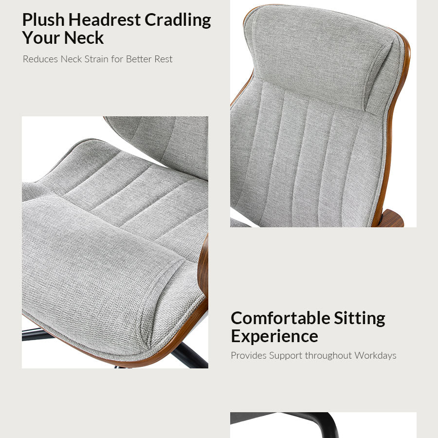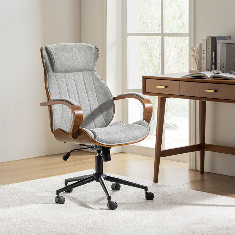 Experience comfort with the premium office chair, designed to enhance your work environment. The chair features a plush headrest that cradles your neck for support, while the ergonomic design ensures a snug fit, providing all-day comfort. Its solid wood armrests are paired with soft padding, offering a refined touch and additional comfort during hours at the desk. This chair is equipped with a 360-degree swivel mechanism, allowing you to move effortlessly and access different areas of your workspace without needing to get up. It's height adjustable, enabling you to find the position for your desk and ensure optimal posture. For added versatility, the chair includes a rocking function, allowing you to lean back and relax or adjust the tension to suit your preferences. Whether you're tackling a busy workday or taking a moment to unwind, this office chair combines style, comfort, and practicality to meet different needs.