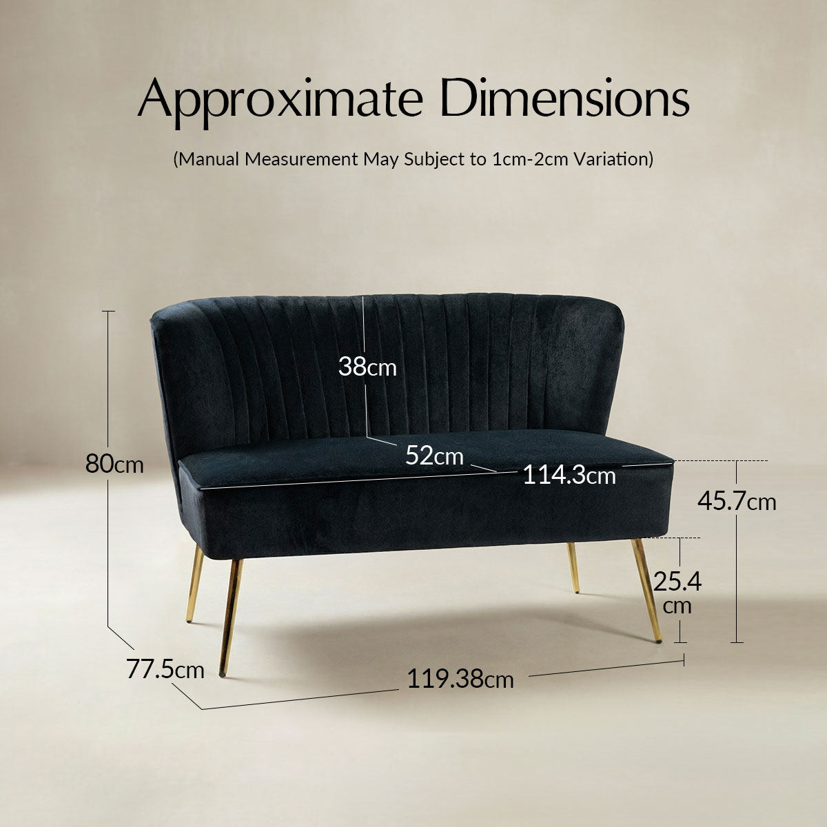 Uncompromising in comfort and beauty, this mid-century modern style two-seater sofa is sure to put anyone's existing arrangement to shame. Medium density foam padding is paired with a solid and faux wood frame to provide comfort and support. This chair is upholstered in a beautiful velvet upholstery fabric. The smooth lines and lightly tufted cushions give a cozy feel. It will not break your bank. Contemporary metal tapered legs and linear silhouette provide a serene and cozy feel, perfect for small spaces! The elegant curved tufted back with a skin-friendly and breathable surface enhances comfort. This small loveseat sofa for you and your loved one brings the soft and warm enjoyment at home. Whether you are looking for an intimate conversation with loved one or a place to stretch out in style, you will be well covered. This loveseat will have no problems blending into your home decoration with its natural and modern style and incredible durability. It's the perfect pick for bedroom, living room and other scenes.