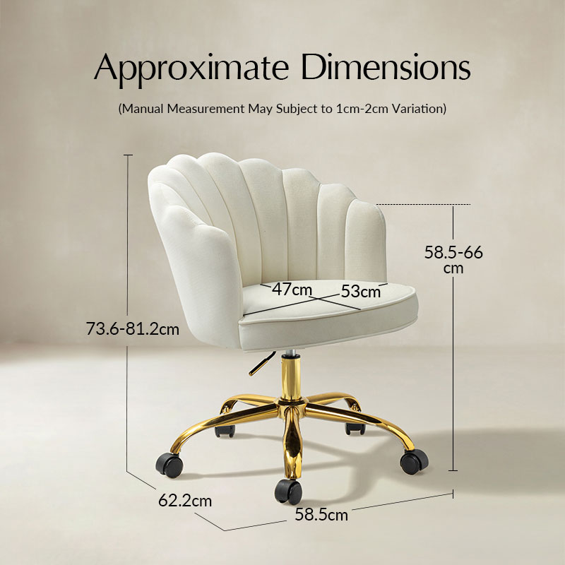 Add a touch of contemporary elegance to your space with a design that is equally functional and stylish. This modern swivel office chair is a wonderful addition to any office or home office with its variety vibrant colors-velvet fabric upholstery that blends with any design taste. Designed in a chic style with flower shape back, tufting and piped edges lend a tailored touch, while foam fill offers comfort and support. Sturdy and durable golden finish metal base and 360-degree wheels allow you to glide to anywhere in the room, height-adjustable to tailor your professional space. The cute computer chair is ideal for any casual or professional working area. It provides comfortable support with a cozy and convenient design.