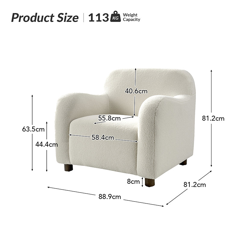 Presenting a contemporary upholstered armchair seamlessly adaptable to both living room and bedroom. Embodying the appeal of creamy style, this accent chair features quality lamb wool cloth upholstery, creating an inviting and cozy atmosphere. The solid wood legs add a touch of natural elegance and ensure sturdiness and stability. Designed for convenience, the armchair boasts a three-minute assembly, requiring only the attachment of the rubber wood legs. This time-saving design enhances the overall user experience, making it a choice for various spaces. Elevate your space with this modern armchair, where style meets functionality for moments of relaxation.