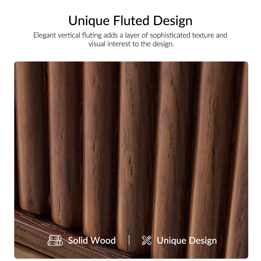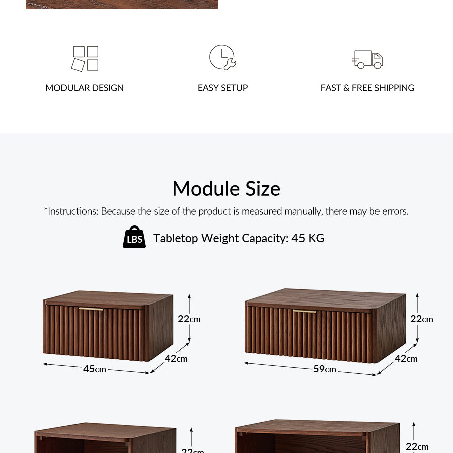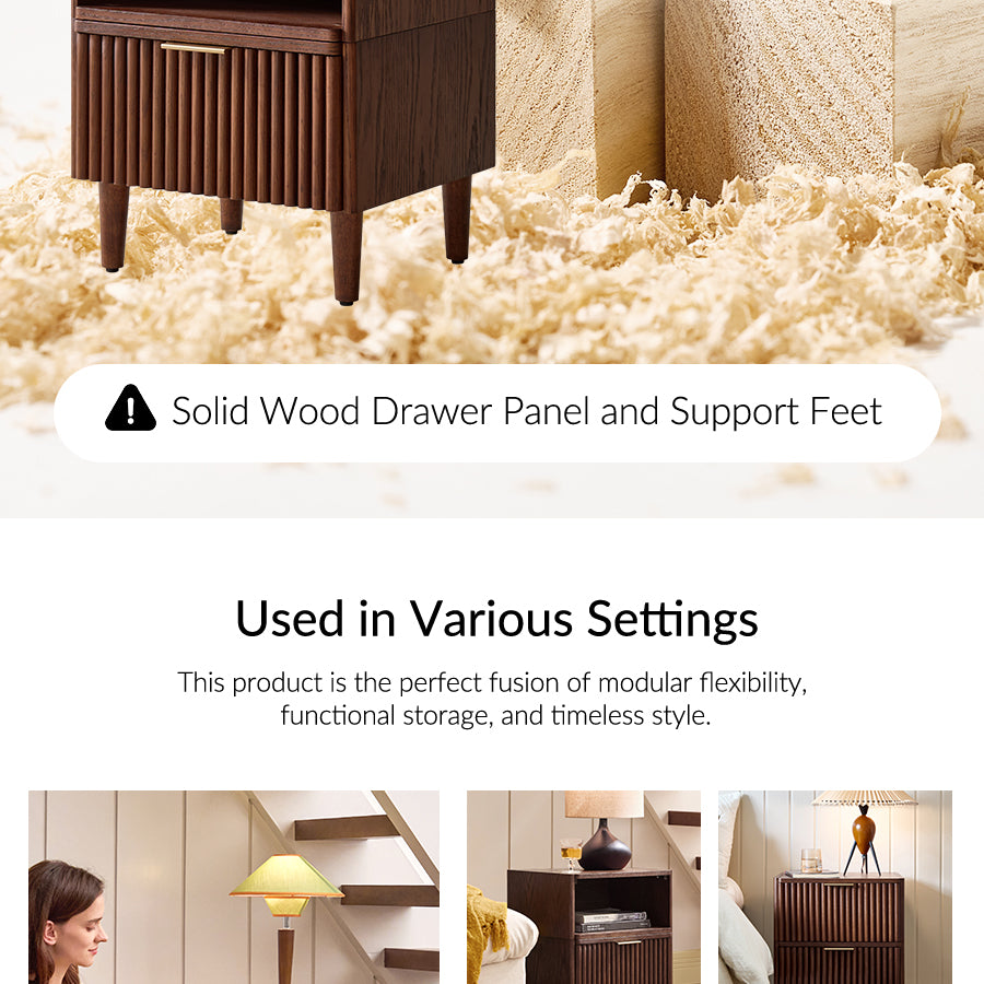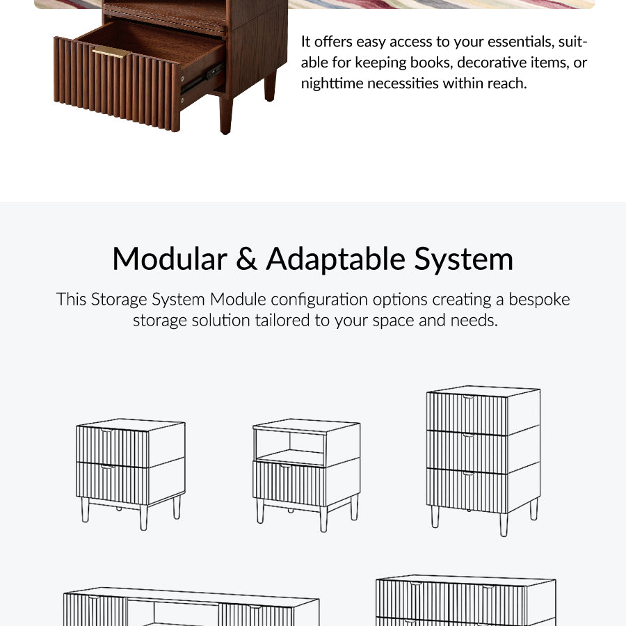 -The product includes one modular unit/one bedside table/chest of drawers/TV unit with quick installation. -Fluted Design:Elegant vertical fluting adds a layer of sophisticated texture and visual interest to the design. -Crafted from Solid Wood: The drawer fronts and legs are made from high-quality solid wood, ensuring inherent durability and a natural warmth. -Modular & Adaptable System:Offering flexible combination options, this bedside table/chest of drawers/TV unit can be configured in multiple forms to create a bespoke storage solution tailored to your space and needs. -Responsibly Sourced Materials:Certified by FSC and OEKO-TEX, ensuring the wood comes from well-managed forests.