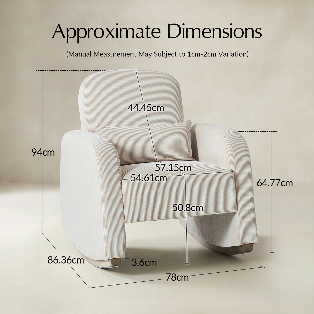 Embrace modern elegance and soothing comfort with this stylish rocking chair. Featuring a sleek modern design, it effortlessly blends into contemporary living spaces. The frame of the chair is crafted from quality solid wood, offering lasting durability and natural charm. The smooth, rounded silhouette adds a touch of softness and warmth, while the gentle rocking motion provides a relaxing experience. Designed with ergonomic support in mind, it comes with a lumbar pillow to enhance comfort and promote healthy posture. Upholstered in corduroy fabric, the surface features a subtle ribbed texture that adds depth and visual interest, while remaining gentle to the touch. Whether placed in a reading corner, nursery, or living room, this rocking chair is the suitable spot to unwind. With its minimalist aesthetic and thoughtful design, it’s more than just a seat—it’s a stylish retreat for everyday relaxation.