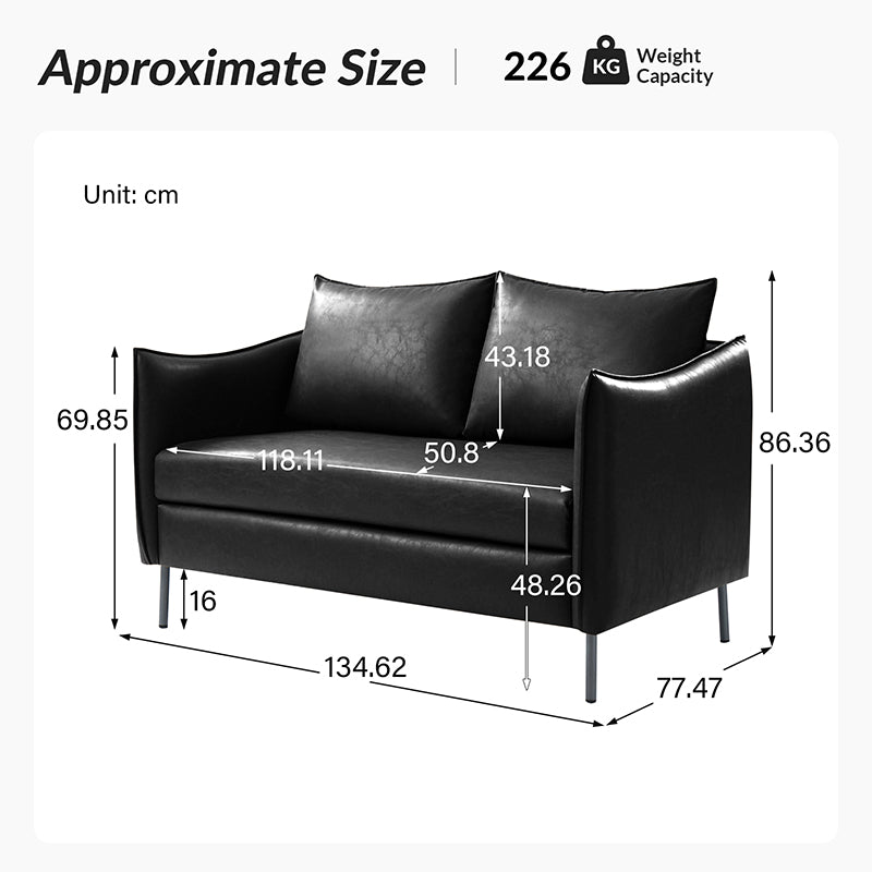 - Product Including: One loveseat, assembly is required. - Movable Cushions and Backrests: The cushions and backrests are detachable and repositionable, allowing for customizable comfort and effortless cleaning. - Loveseat Size: Designed as a loveseat, it comfortably seats two people, making it perfect for cozying up in smaller living rooms or as an accent piece in larger spaces. - Sturdy Metal Legs: Equipped with robust metal legs, this loveseat enhances stability and support, complementing its industrial aesthetic. - Qualify Leather Upholstery: The sofa is upholstered in durable PU leather, providing a luxurious look while being easy to clean and maintain. - Modern and Industrial Style: This loveseat features a sleek, contemporary design with industrial elements, adding a touch of modern sophistication to your space.